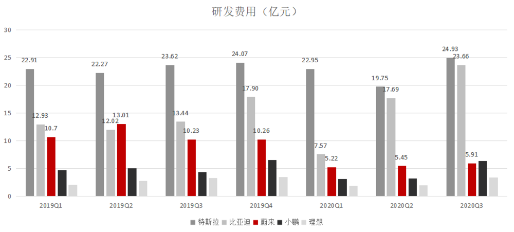 2019年Q4及以前,蔚来的研发费用单季度研发费用均超过10亿,2019年Q2甚至一度占特斯拉的58%,排在三势力第一。但2020年,获得巨额融资的蔚来,研发投入不升反降,为了控本降费,研发费用直接砍一半,单季度只有5亿元左右,2020年Q3只有5.91亿元,占特斯拉的23.7%,甚至比小鹏还低。2020Q4研发费用8.29亿元,略有回升。