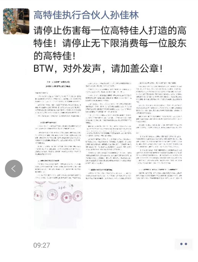 此外,刚被宣布开除的孙佳林也在朋友圈表示“请停止伤害每一位高特佳人打造的高特佳!请停止无下限消费每一位股东的高特佳!”。金惠丽对其开除的理由是“在集团谋求非法任职,越级组织会议,传播不实言论,妄图协助非法接管公司”。