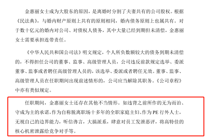 随后,曾被外界称作“最强原配”的金惠丽展开反击,3月7日下午,一封金惠丽署名的“我的声明”及两份《处分决定》流出,文件直指蔡达建“集结各方势力并伙同部分内部员工”,正在争夺公司控制权。