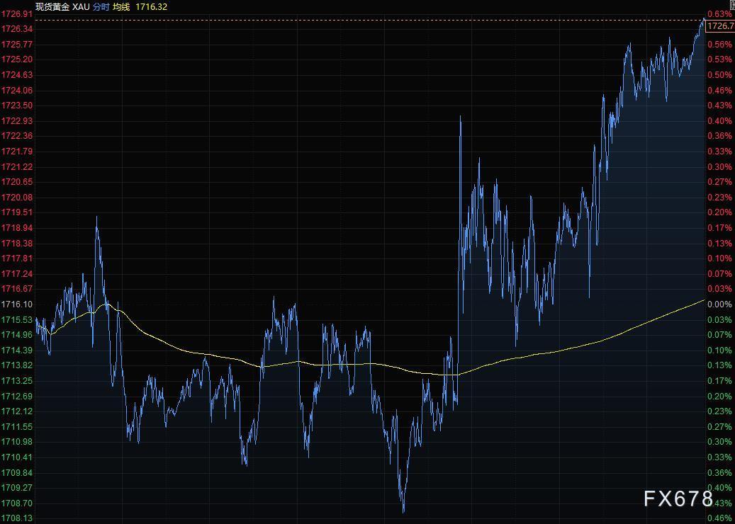 现货黄金第二个交易日上涨,现货黄金创近一周新高至1726.91美元/盎司,因美元和美国国债收益率的回落提振了对这种另类资产的需求。美元疲软使以美元计价的商品(如黄金)对持有其他货币的投资者更具吸引力。