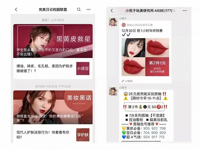 在每一款完美日记的产品之中,都会有一张“口令红包卡片”,上面会有完美日记微信服务号二维码以及“小完子”个人微信号。在完美日记内部,所有微信群中的运营人员,统一使用名为“小完子”或“小美子”的个人微信号。对外宣传中,二人被描绘为“不仅懂专业的美妆知识也是懂你的朋友”,而在完美日记内部“小完子”对应的岗位名为“粉丝运营专员”,平均月薪5000~10000元。当用户通过扫描产品红包卡上二维码添加“小完子”为好友后,小完子便会把用户拉入微信群中。