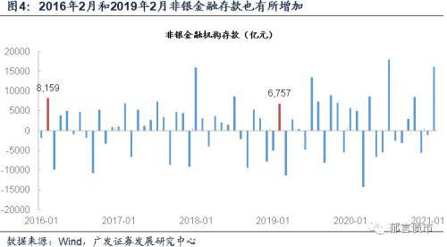 二是非银金融机构存款增量较大。2021年2月非银金融机构存款增加1.61万亿元,同比多增1.12万亿元。从历史数据来看,非银金融机构存款存在一定程度的季节性,往往对应季末月减少(转为银行负债端的企业或居民存款),季初月增加。而近几年春节在2月时,非银金融机构存款往往在2月也会出现较大幅度增长,例如2019年2月增加6757亿元(当年1月为减少5079亿元);2016年2月增加8159亿元(当年1月为减少1919亿元),2021年2月增加1.61万亿元(1月为减少1120亿元)。春节因素可能使得季初非银金融机构存款增加的季节性规律被延后。