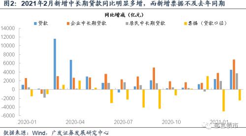 新增中长期贷款延续高增,或与基建相关项目开工提前有关。2021年2月新增人民币贷款中,企业中长期贷款同比多增6843亿元;票据、企业短期贷款分别同比多减2489亿元、4052亿元。从而体现出企业中长期贷款同比多增、短期贷款和票据同比减少的情况,银行可能在调整贷款结构,压降表内票据,为中长期贷款腾挪额度。在“不急转弯”的政策基调下,叠加就地过年,今年的基建相关项目开工可能提前(与2月财政支出规模较大相对应),带来了较大的中长期贷款需求。