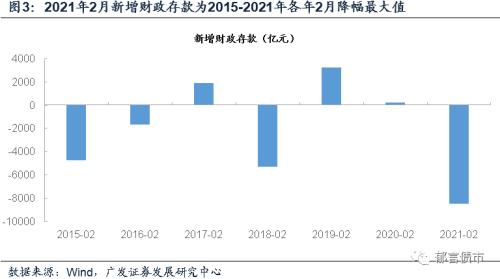 一是财政存款减少量较大,反映财政支出量较大,对应2月支出进度较快。2021年2月财政存款减少8479亿元,同比多减8687亿元,对应财政资金从国库中流出,转至金融系统,对流动性形成补充。新增财政存款下降幅度,为2015-2021各年2月降幅最大值。财政存款的变化,一般对应财政收入与财政支出的差额,再加上国债和地方债净发行缴款额。考虑到2021年2月国债和地方债净发行较2020年同期低4200亿元,只能解释2021年2月财政存款同比多减8687亿元的不到一半;因而背后的另一个因素可能是2021年2月财政支出大于往年同期,反映2月财政支出进度较快。财政存款释放的增量流动性,从供给层面,使得2021年2月末到3月初的资金面得以维持相对宽松状态。