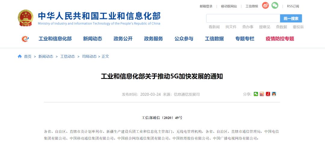 2020年3月24日,工业和信息化部发布关于推动5G加快发展的通知。通知要求加快5G网络建设部署,支持基础电信企业以5G独立组网(SA)为目标,控制非独立组网(NSA)建设规模,加快推进主要城市的网络建设,并向有条件的重点县镇逐步延伸覆盖。丰富5G技术应用场景,持续加大5G技术研发力度,着力构建5G安全保障体系。