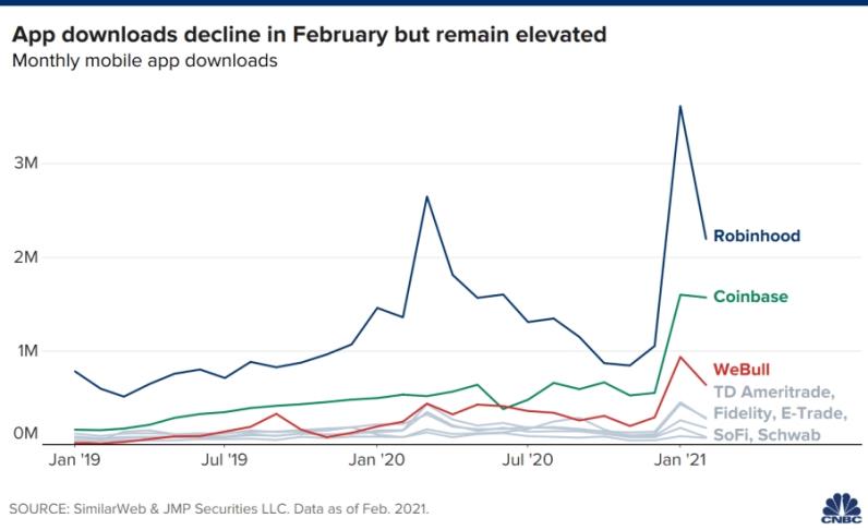 据CNBC,受千禧一代青睐的股票交易应用程序Robinhood 2月的下载量突破了210万,比去年同期增长55%。尽管下载量较1月的360多万有所回落,但这仍然表明新手投资者在进入市场。