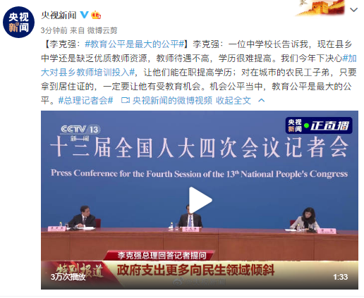 【李克强:#教育公平是最大的公平#】李克强:一位中学校长告诉我,现在县乡中学还是缺乏优质教师资源,教师待遇不高,学历很难提高。我们今年下决心#加大对县乡教师培训投入#,让他们能在职提高学历;对在城市的农民工子弟,只要拿到居住证的,一定要让他有受教育机会。机会公平当中,教育公平是最大的公平。