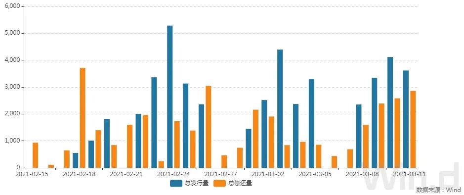 3月11日,债券市场共发行298只债券,总发行量3618.43亿元,187只债券到期,14只债券提前兑付,1只债券回售,无债券赎回,总偿还量2856.68亿元,当日净融资额为761.45亿元。