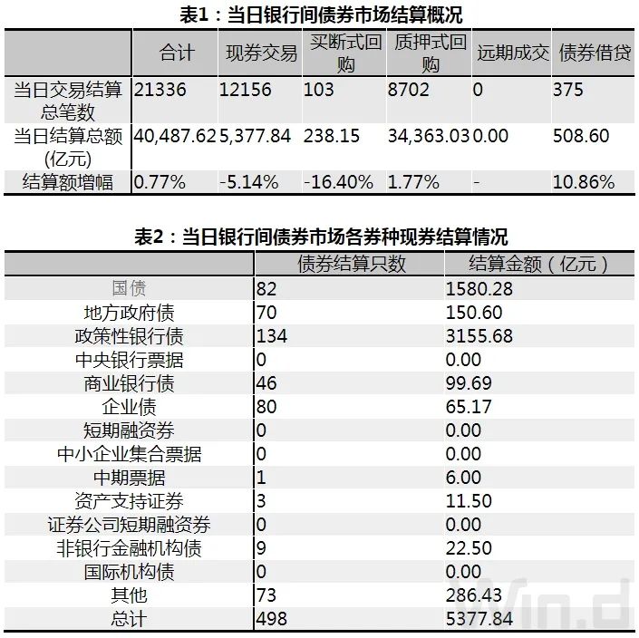 3月11日(周四),全国银行间债券市场结算总量为40,487.62亿元,较上日增加0.77%,交易结算总笔数为21336笔。其中,质押式回购34,363.03亿元,买断式回购238.15亿元,现券交易5,377.84亿元,债券借贷508.60亿元。银行间债券市场回购利率以上行为主,其中隔夜回购利率上行5.3bp至1.817%。