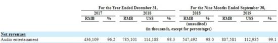 而喜马拉雅的上市节奏缓慢,不代表对手也同样缓慢。这一年,荔枝率先开启了赴美上市的旅途,荔枝与喜马拉雅、蜻蜓等以PGC有声内容为主的平台不同,主打UGC社区,2019年荔枝已经是国内最大UGC音频社区,其市占率高达70.7%。虽然荔枝处在亏损状态,用户体量也不如喜马拉雅,但是作为国内首个上市的音频平台,它还是开启了内容有声市场的新纪元。