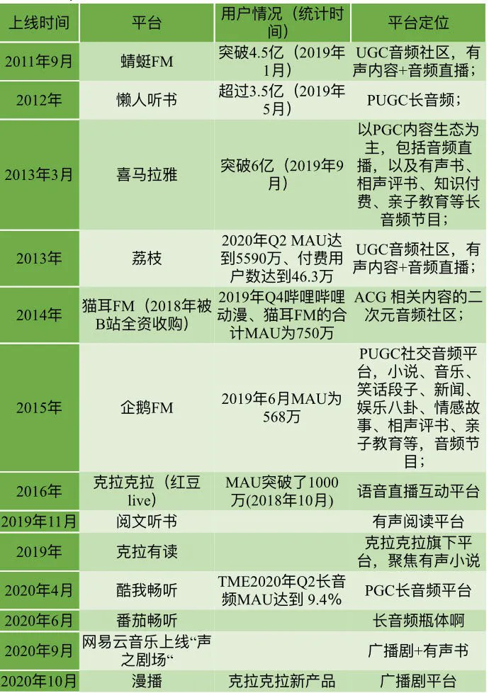 2019年开始有声市场频频出现变动,首先是阅文听书、酷我畅听、番茄听书等新平台崛起,随后是TME收编懒人听书,QQ音乐、酷狗音乐、网易云音乐等纷纷布局长音频内容,音频赛道的玩家越累越多,并且都有着实力雄厚的母平台,走着与喜马拉雅类似的路径。