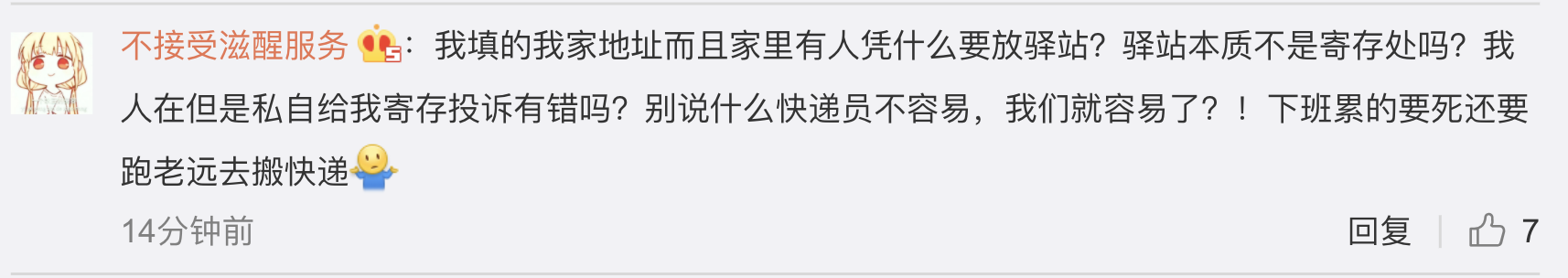 对于快递放驿站问题,网友们提出了不同的看法。有网友认为,“填家里的地址为什么要放驿站?”