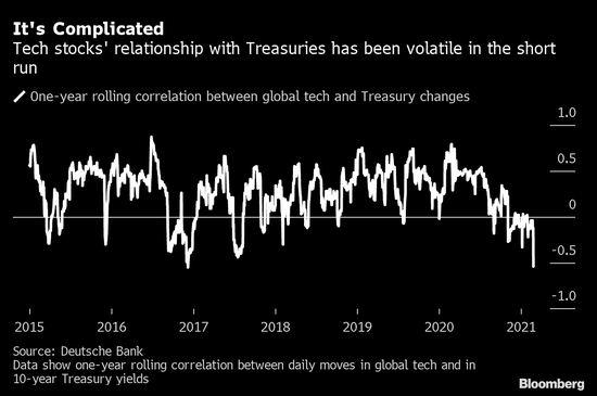 德意志银行量化策略师Andreas Farmakas表示,这展示了科技股与美国国债缺乏直接而持续的联系。实际上,这些股票过去常常随收益率上升,因为收益率上升被视作经济强劲信号,而这可能有利于企业盈利。