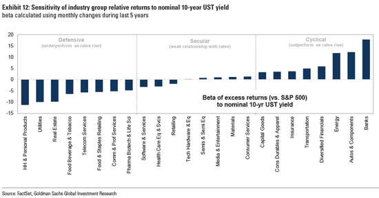 与之类似的是,德意志银行量化指标显示,债券与科技股之间的beta系数自2015年来为零。相比之下,金融和能源板块与债券收益率的正相关系数最高,公用事业和房地产板块与收益率的负相关性最高。