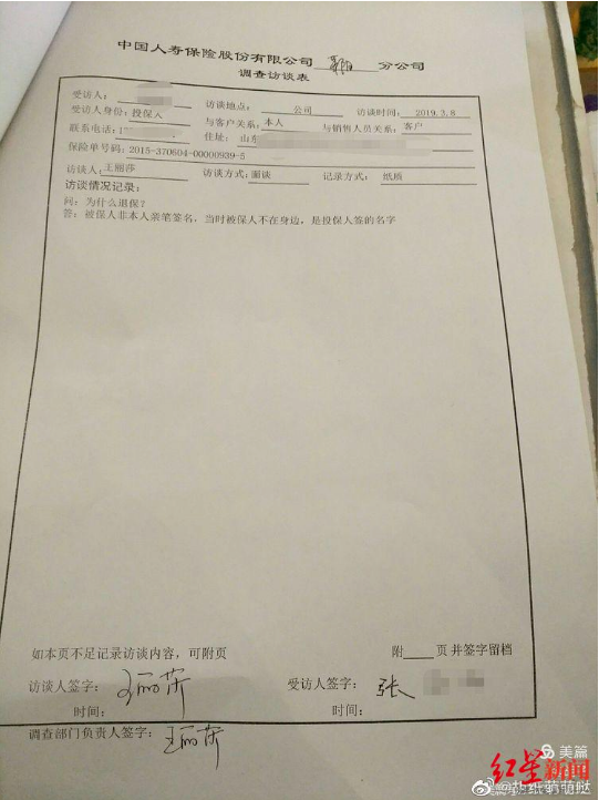 胡泽昌介绍,这其中还有一个插曲,2019年3月在胡泽昌提出全额退保诉求后,时任中国人寿莱阳支公司客服部经理王丽莎向他出具了一份调查访谈表,访谈时间为2019年3月8日,受访人是胡泽昌的母亲,访谈人是客服部经理王丽莎。在访谈记录上只有一个问题:“为什么退保?”答为:“被保人非本人亲笔签名,当时被保人不在身边,是投保人(胡的母亲)签的名字。”
