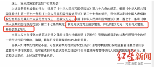 2020年3月6日,烟台银保监对此事出具了行政处罚决定书(烟银保监罚决字[2020]3号):经查,王丽莎在处理消费者张某、胡某的投诉过程中,制作虚假的《调查访谈表》,并在《调查访谈表》中代张某签名,直接实施了违法行为,为案件的直接责任人。中国人寿保险股份有限公司莱阳市支公司经理幺传义存在管理不到位,为对案件直接负责的主管人员。因此决定对中国人寿保险股份有限公司莱阳市支公司责令改正,罚款12万元,对王丽莎与幺传义警告,并处罚款2万元。