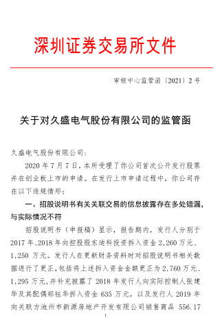 深交所指出,作为发行上市申请文件信息披露的第一责任人,久盛电气未按照《公开发行证券的公司信息披露内容与格式准则第 28 号——创业板公司招股说明书》的规定,在招股说明书(申报稿)中准确、完整地披露关联交易信息,且未按照要求逐项回复深交所审核问询。发行人上述行为违反了《深圳证券交易所创业板股票发行上市审核规则》(以下简称《审核规则》)第二十八条、第四十二条的规定。