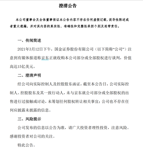 3月12日下午,有消息称,“京东正就收购国金证券部分或全部股权进行谈判,价值高达15亿美元。”