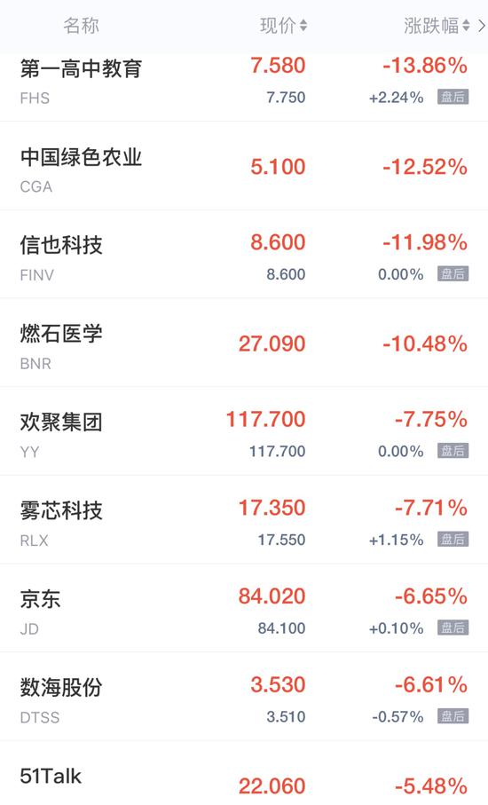 其他热门中概股中,欢聚集团、雾芯科技跌近8%,腾讯ADR跌超7%,百度跌近3%,网易、哔哩哔哩跌0.4%,有道涨0.82%、新东方涨超4%,途牛涨超12%。