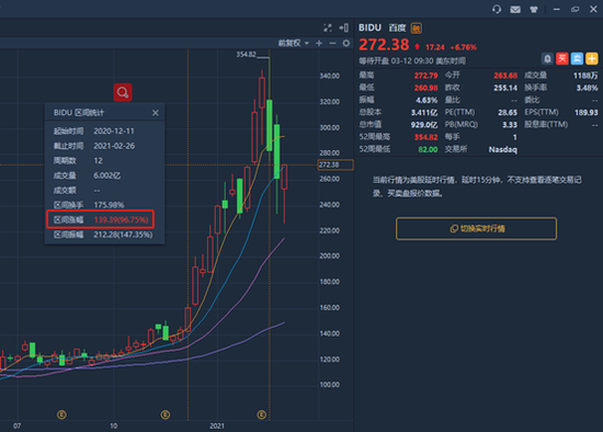 百度美股的涨幅亦是十分亮眼,在2020年最后一天股价大涨近13%,创52周内新高;进入2021年市场最高突破千亿美元,虽近期回落,但仍为2020年初股价的2倍有余。