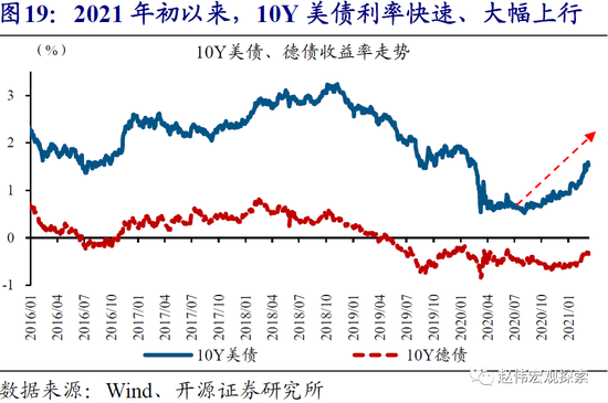 (6)疫情改善、通胀加速抬升下,美联储官员对经济前景越发乐观,对未来政策路径的表态越发“暧昧”。相反,欧央行持续释放鸽派信号,并在最新的3月利率决议中,承诺将加快购债速度、强调不排除进一步加码宽松的可能。伴随美欧经济走势及货币政策预期不断分化,美德利差由120bp大幅走扩至180bp以上。