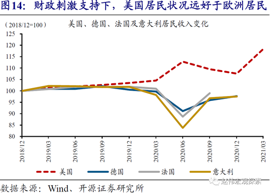 疫情加速改善,及多轮大规模财政刺激政策的支持下,美国经济复苏的弹性空间远超欧洲。随着疫情加速改善,美国工业生产、餐饮消费等的修复均显著加快,表现远好于欧盟。同时,美国前后连续多轮大规模财政刺激政策的实施,以及政策中直接向居民“发钱”等,使美国居民收入水平在疫情后不降反升。疫情加速改善,及私人部门更加健康的资产负债表,使美国经济的复苏弹性空间远超欧盟。