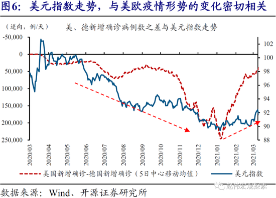 疫情扩散以来,美元指数的走势,主要与美欧疫情形势的变化密切相关。由于欧元在美元指数中占比较高,中短期内,美欧经济偏离程度对美元指数走势影响最大。2020年5月后,美元指数持续走弱,与美国疫情形势控制差于欧洲、导致经济复苏进程慢于欧洲等紧密相关。相反,2021年初以来,随着美国疫情形势开始加速好转、经济复苏进程逐渐超过欧洲,美元指数自低位大幅反弹。正如数据所显示的,美元指数走势,与美德新增确诊病例之差的变化高度负相关。