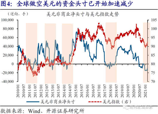 (1)美元指数2020年持续、大幅走弱之后,看空美元的言论频频出现,并逐渐成为市场主流预期。但在市场一片看空声音中,美元指数自2021年初起,由89.4大幅反弹至91.67。伴随美元反弹,全球做空美元的资金头寸较2020年加速减少。