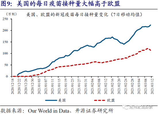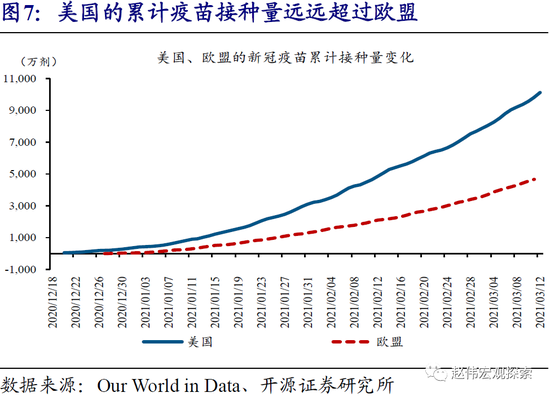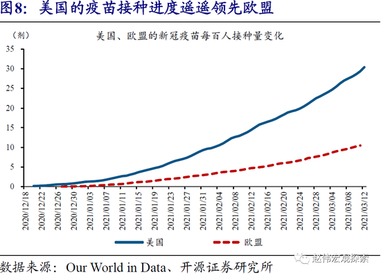 伴随疫苗供应大增、接种速度持续加速提升,美国有望比欧洲更早实现群体免疫。疫苗供应方面,辉瑞、莫德纳及强生纷纷提升对美国的疫苗交付速度,并承诺于7月底前向美国合计交付7亿剂疫苗。与美国相比,欧盟虽然也预定了足量疫苗,但受制于产能问题,实际收到的疫苗数量远不及既定计划。疫苗接种方面,截至3月12日,美国累计完成超1亿剂疫苗接种,远远超过欧盟的4663万剂;美国单日疫苗接种量已稳定在220万剂/日以上,相当于欧盟的2倍水平。结合疫苗供应及接种速度来看,美国有望在6月上旬接近群体免疫目标,领先欧盟至少1个季度以上。