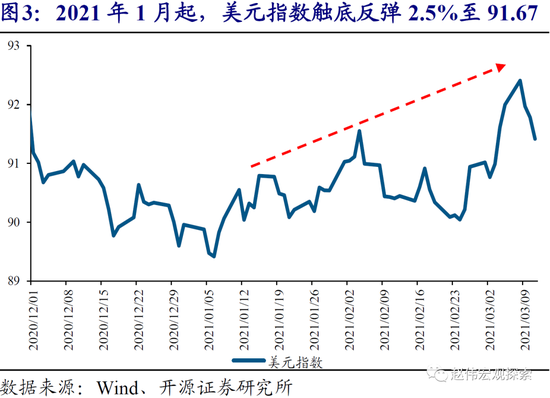 2021年初至今,市场一片看空声音中,美元指数自低位大幅反弹。美元指数2020年持续、大幅走弱之后,以“美元将趋势走弱”为代表的看空美元言论频出,并逐渐成为市场主流声音。但2021年初以来,美元指数一改颓势,自低位的89.4大幅反弹至91.67。伴随美元反弹,全球做空美元的资金头寸较2020年加速减少。