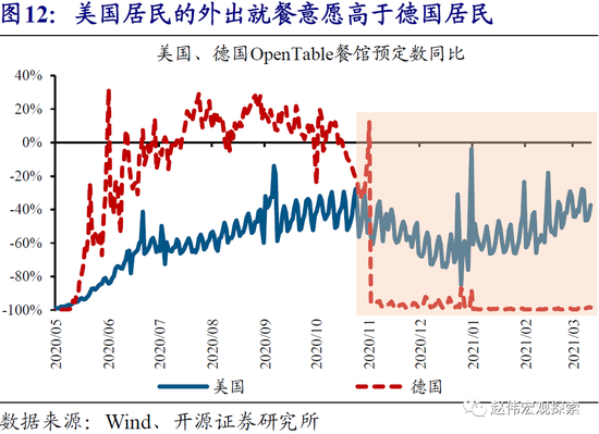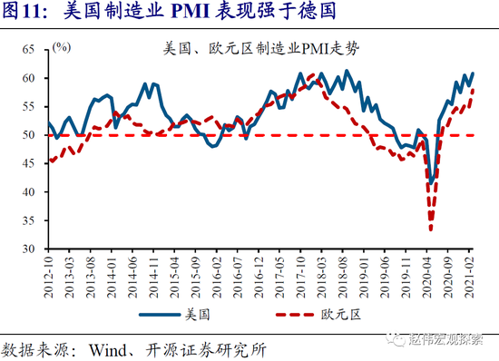 疫情加速改善下,美国经济基本面表现持续强于欧洲,工业生产、餐饮消费等修复显著加快。最新经济数据显示,美国2月制造业PMI录得60.8%、刷新近3年高,并高出欧元区及德国等制造业PMI水平。线下经济活动当中,美国工业生产的修复持续加快,居民的出行意愿也明显升温。从OpenTable公布的餐馆预定数来看,美国餐馆预定数同比已从-85%的低点修复至-37%,而德国依然处于-98.5%的历史低位。