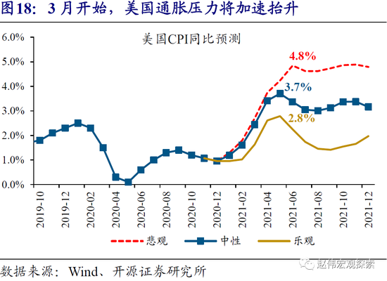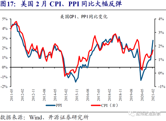 伴随疫情加速改善、经济修复加快,美国就业景气开始回升,通胀也进入到快速上涨通道。疫情加速改善下,美国每周申请失业金的人数不断下滑,2月当月非农就业人口也录得增长37.9万人、大超预期。前期受疫情反弹拖累的服务业整体及休闲、酒店业等就业,均表现亮眼。通胀方面,美国2月CPI同比增长1.7%、创2020年3月以来新高,2月PPI同比增长2.8%、为2018年10月来最大涨幅。根据我们的预测,伴随经济修复加快及油价上涨,美国CPI同比可能于3月后升至2%以上、高点甚至可能超4%。