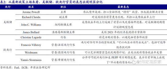 从美、欧央行最新表态来看,美联储对未来政策路径的表态越发暧昧,而欧央行继续传递鸽派信号、甚至公开喊话存在加码宽松可能。在经济基本面趋势向好的背景下,美联储官员对经济前景的看法越发乐观,对未来政策路径的表态越发“暧昧”。以美联储主席鲍威尔为例,他不断重申宽松立场不变,但又频频表达对美国经济前景的乐观预期,对于美国债券市场近期的波动也“无动于衷”。相比美联储,欧央行在持续释放鸽派信号的同时,还“付诸”实际行动。在最新的3月利率决议中,欧央行承诺将加快购债速度,并表示未来不排除进一步加码宽松的可能。