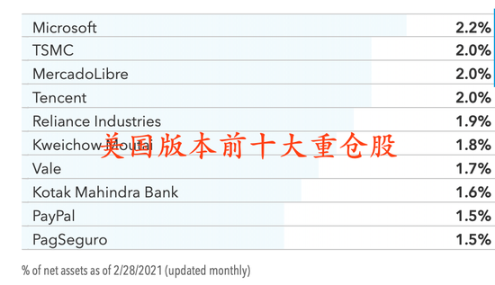 值得注意的是,晨星显示的为这只基金在欧洲、亚洲发行的版本(简称“欧亚版”),相较于在美国发行的版本,规模较小。根据晨星数据,截至3月11日,该版本规模仅4.03亿美元。不过两个版本由同一班基金经理(共12位)管理,采取相同的投资策略。