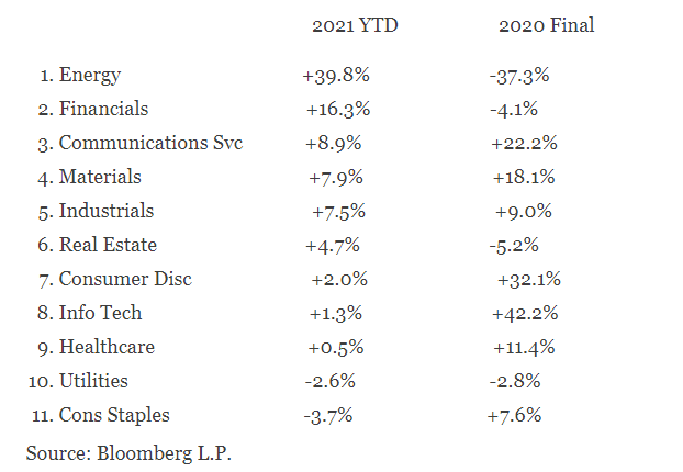 上周道指和标普500指数收盘创历史新高,对美国经济前景的乐观情绪及新一轮刺激计划落地,继续鼓励投资者转向周期性板块,今年以来,金融、能源、原材料和工业等板块持续跑赢市场,这种资金从较高估值板块流向较低估值板块的虹吸现象,是通货再膨胀交易(reflation trade)的主要特征。而飙升的美债收益率重新引发了对估值的担忧,形成对科技股反弹的威胁。所谓通货再膨胀交易,指的是市场预期经济开始复苏,投资者纷纷买入能从中获利的资产。