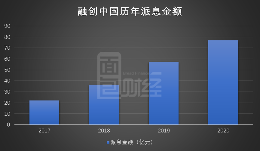 融创中国计划宣派截至2020年12月31日止年度的末期股息1.650元每股,同比提升33.9%,共计派发约76.94亿元,派息金额逐年上升。