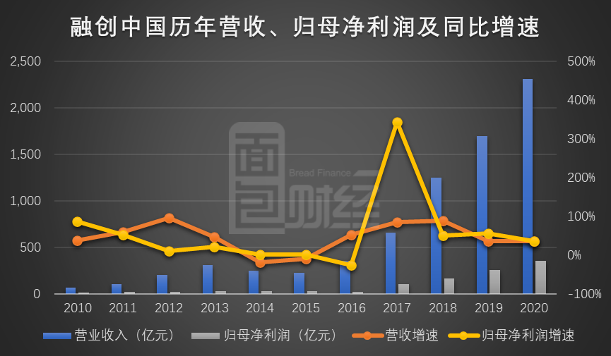 融创中国2020年营收、利润均创2010年港交所上市以来新高。数据显示,公司2020年实现营收2305.9亿元、归母净利润356.4亿元,同比分别增长36.2%和36.9%。