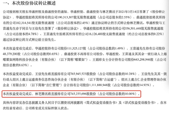 3月14日晚间,世纪华通发布公告称,公司控股股东、董事长王苗通旗下的浙江华通控股集团有限公司及其一致行动人绍兴市上虞鼎通投资合伙企业(有限合伙)与林芝腾讯科技有限公司于2021年3月14日签署了《股份转让协议》。