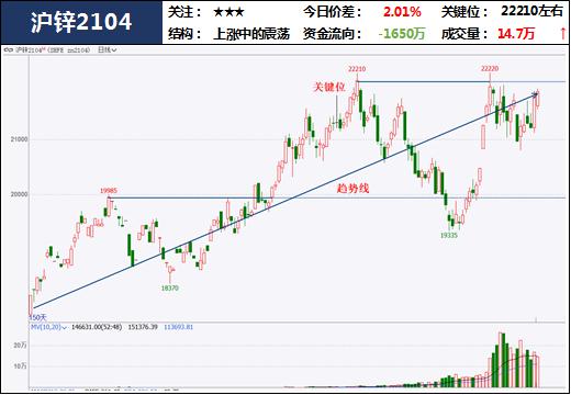 受到美国通过刺激法案、美债收益率与美元高位回落、美国经济恢复情况良好的提振,市场情绪回暖,今日有色金属多数走高。锌受到下游复工而上游社库减少的支撑,预计偏强运行。今日盘中减仓上行,22000附近承压,有色板块震荡上行思路不变,注意多单介入时机,不建议追涨。