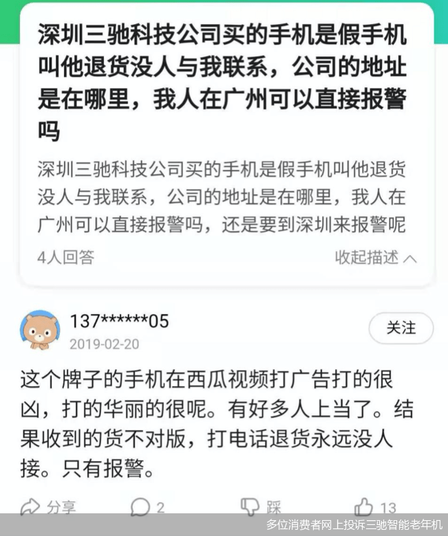 其实,在网络社交平台上表示自己和王阿姨有类似遭遇的消费者不在少数,他们大多都是看到电视广告推销后,购买了节目中提及的“三驰老年智能手机”,但却收到了货不对板的产品。多位消费者均表示无法拨通客服电话,还有消费者称,自己收到的包裹没有寄件地址,上面的联系电话也并非实名认证,找不到寄件公司和退货地址。
