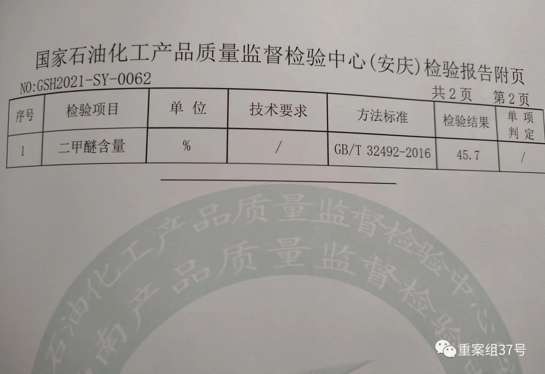 为了解除疑惑,新京报记者将从亚龙气站购买的液化气送到专业机构检测。结果显示,这罐液化气二甲醚的含量高达36.9%。