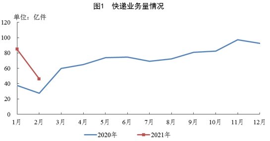 2月份,全国快递服务企业业务量完成46.2亿件,同比增长67.0%;业务收入完成515.7亿元,同比增长41.5%。