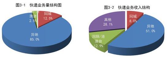1-2月,同城、异地、国际/港澳台快递业务量分别占全部快递业务量的12.5%、85%和2.5%;业务收入分别占全部快递收入的8%、51%和12.9%。与去年同期相比,同城快递业务量的比重下降5.4个百分点,异地快递业务量的比重上升5.8个百分点,国际/港澳台业务量的比重下降0.4个百分点。