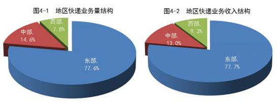 1-2月,东、中、西部地区快递业务量比重分别为77.6%、14.6%和7.8%,业务收入比重分别为77.7%、13%和9.3%。与去年同期相比,东部地区快递业务量比重下降2.4个百分点,快递业务收入比重下降2.2个百分点;中部地区快递业务量比重上升2.9个百分点,快递业务收入比重上升2.3个百分点;西部地区快递业务量比重下降0.5个百分点,快递业务收入比重下降0.1个百分点。