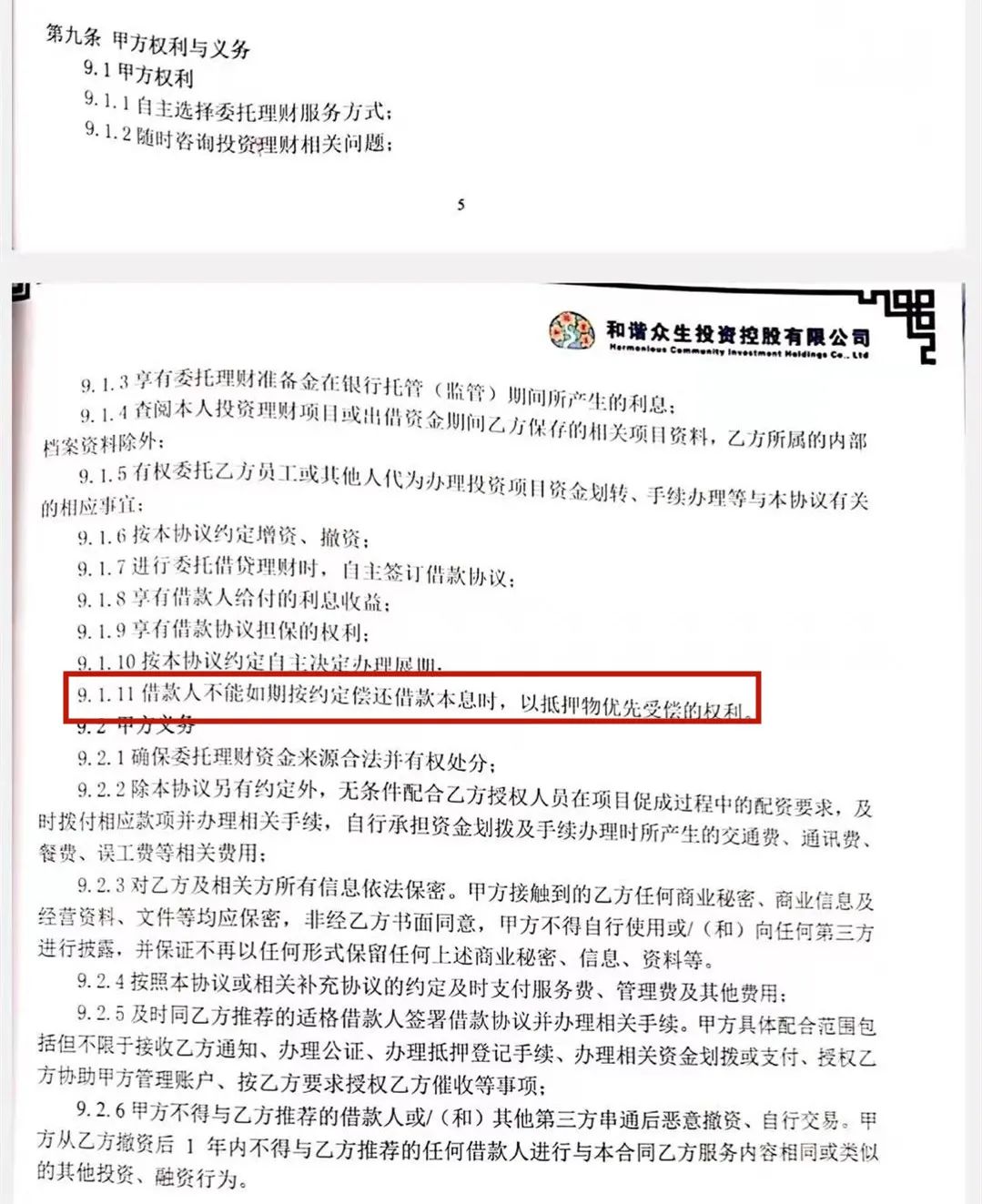 但是,从合同约定层面来看,将房子进行抵押的“贷款人”,并非是和谐众生公司,而是赵红、李广益等当事人。新京报记者在赵红提供的一份与和谐众生公司签订的合同中看到,双方约定,甲方(即赵红一方),通过乙方(和谐众生公司一方)的评估、推荐,与出借人达成“借款协议”,赵红一方向出借人借取资金。同时,赵红一方在获得借款后,再将该笔借款存入和谐众生指定的银行账户,委托和谐众生公司为其提供理财服务,和谐众生公司按照预期年化5%(即0.416%月收益)向赵红一方支付理财收益。