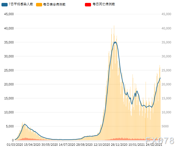 上周意大利的新冠病毒感染总数超过了300万,这在很大程度上是由B.1.1.7变种的快速传播造成的。迄今为止,意大利已记录了310万例新冠肺炎病例和101184例死亡。下图是意大利每日确诊及死亡人数数据: