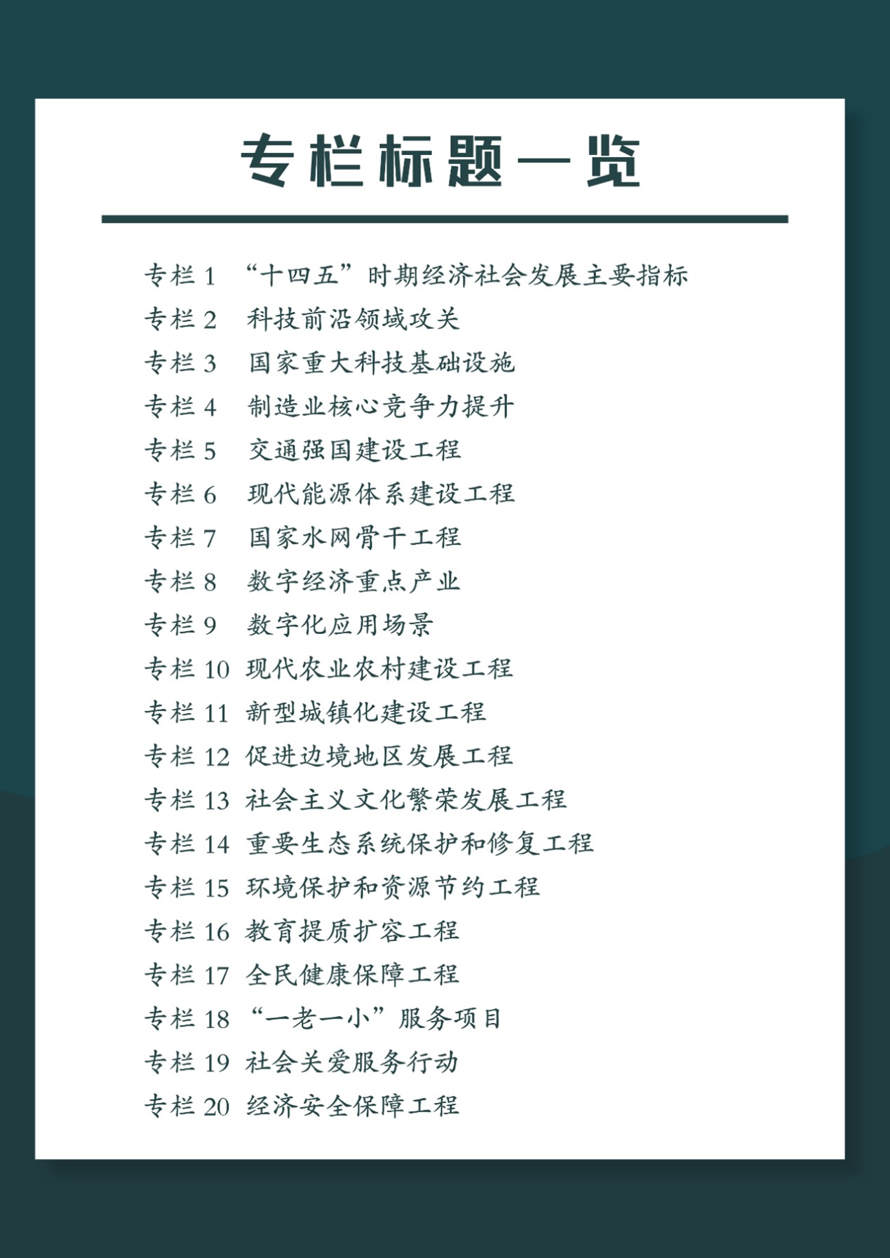 归结起来,专栏选取工程项目,聚焦的是各领域的短板或突破口。除专栏中的工程项目外,《纲要》还在正文中提了不少重大政策、重大改革的内容。这些都是在从《建议》到《纲要》的过程中,各部门认真研究、协调的结果,和工程一样是《纲要》的重要抓手。工程包、政策包、改革包的组合,共同构成了规划实施的有效手段。