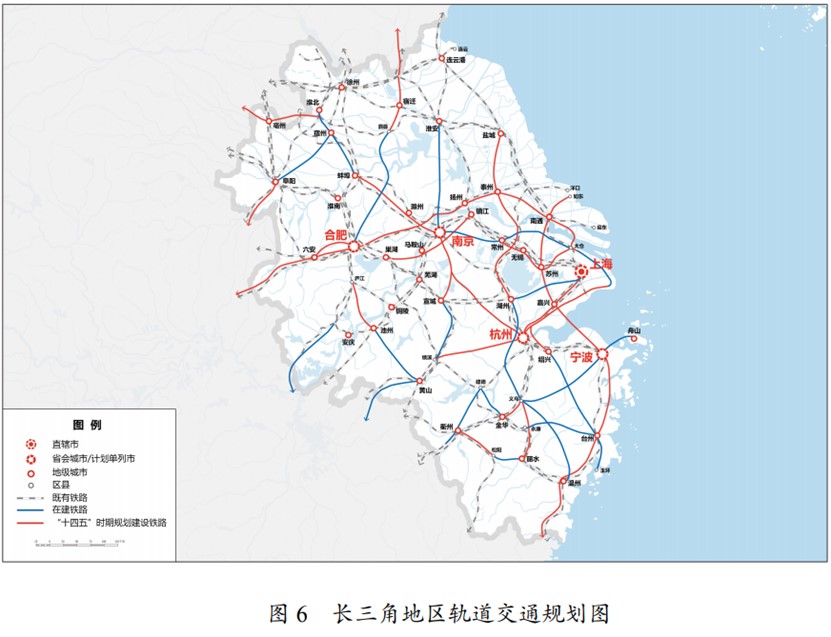 图4、5、6三张颇有意思,甚至可说出乎意料,在国家规划里放三个区域的轨道交通规划图,值得回味。文中说,“基本建成轨道上的京津冀”,想来也要建成轨道上的长三角、轨道上的大湾区了。真正的区域融合和一体化,首先要缩短距离感,没毛病。