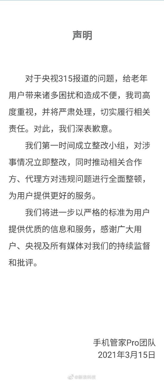 针对央视3·15晚会曝光的“手机管家Pro”问题,开发商安狗狗(深圳)信息技术有限公司发布了致歉声明。声明中表示,将成立整改小组,对涉事情况立即整改。