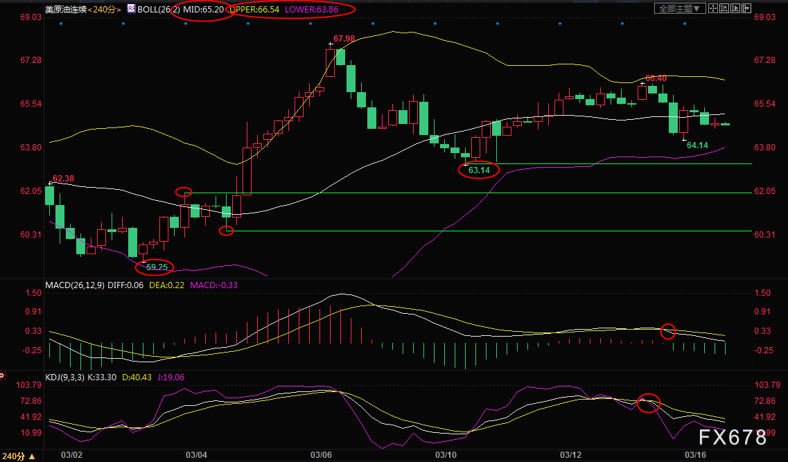 震荡;布林线轨道水平运行,有收口迹象,留意布林线轨道63.86-66.54区域突破情况,目前MACD死叉,KDJ死叉,油价偏向试探布林线下轨63.86附近支撑,如果失守该支撑,则有望打开下跌通道。